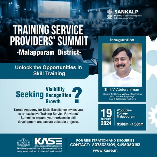 നൈപുണ്യ വികസന പ്രവര്ത്തനങ്ങളുടെ ഭാഗമായി മലപ്പുറം ജില്ലാ ഭരണസംവിധാനവും ജില്ലാ നൈപുണ്യ സമിതിയും സംസ്ഥാന നൈപുണ്യ വികസന മിഷനും (KASE) സംയുക്തമായി ഡിസംബര്19 ന് രാവിലെ 9.30 ന് മലപ്പുറം വുഡ്ബെയ്ന് ഫോളിയേജില് നൈപുണ്യ പരിശീലന ദാതാക്കളുടെ സമ്മിറ്റ് നടത്തുന്നു. ബഹു. മന്ത്രി ശ്രീ. വി. അബ്ദുറഹിമാന് സമ്മിറ്റ് ഉദ്ഘാടനം ചെയ്യും. കേരളത്തിന്റെ നൈപുണ്യ വികസന പ്രവര്ത്തനങ്ങളുടെ നോഡല് ഏജന്സിയായി പ്രവര്ത്തിക്കുന്ന സംസ്ഥാന നൈപുണ്യ വികസന മിഷന് ഉച്ചകോടിക്ക് മേല്നോട്ടം വഹിക്കും.